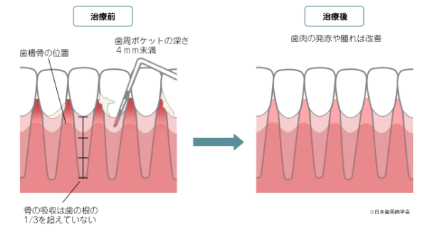 軽度歯周炎では、上記の治療法により歯肉の炎症が改善し、健康な状態にすることができます。
