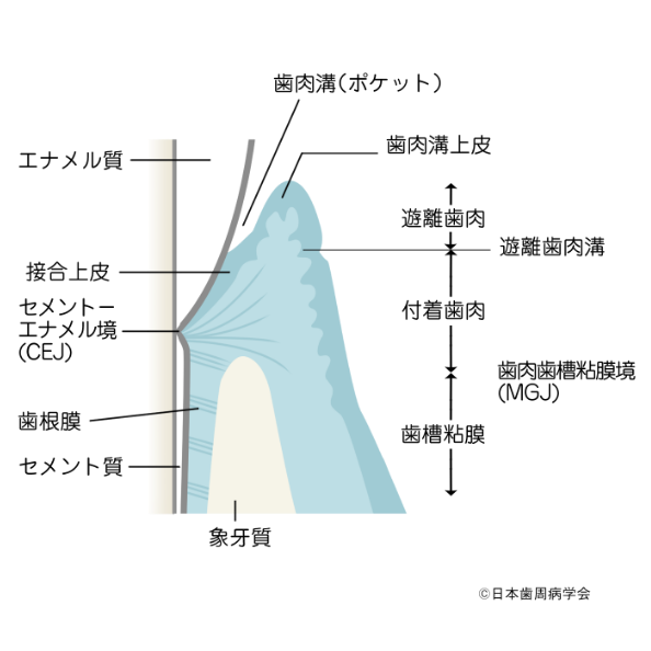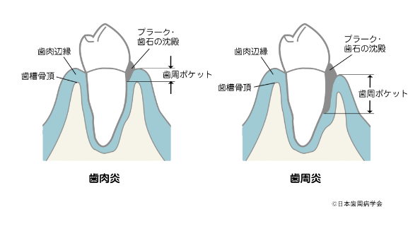 歯槽骨吸収や歯根と歯槽骨の間にある歯根膜の破壊があり、ポケットの底部が歯根の先端方向に移動した状態を歯周ポケット(真性ポケット)とよび、その場合の病名は歯周炎です。